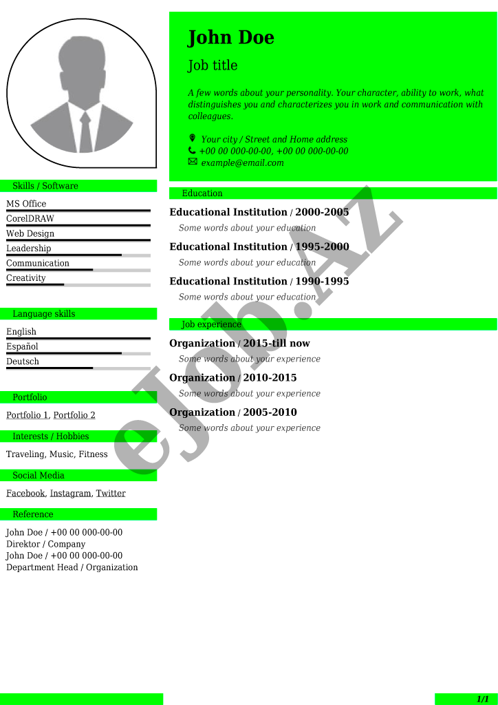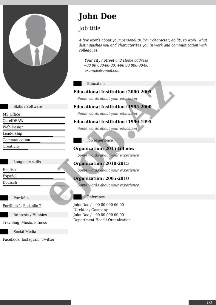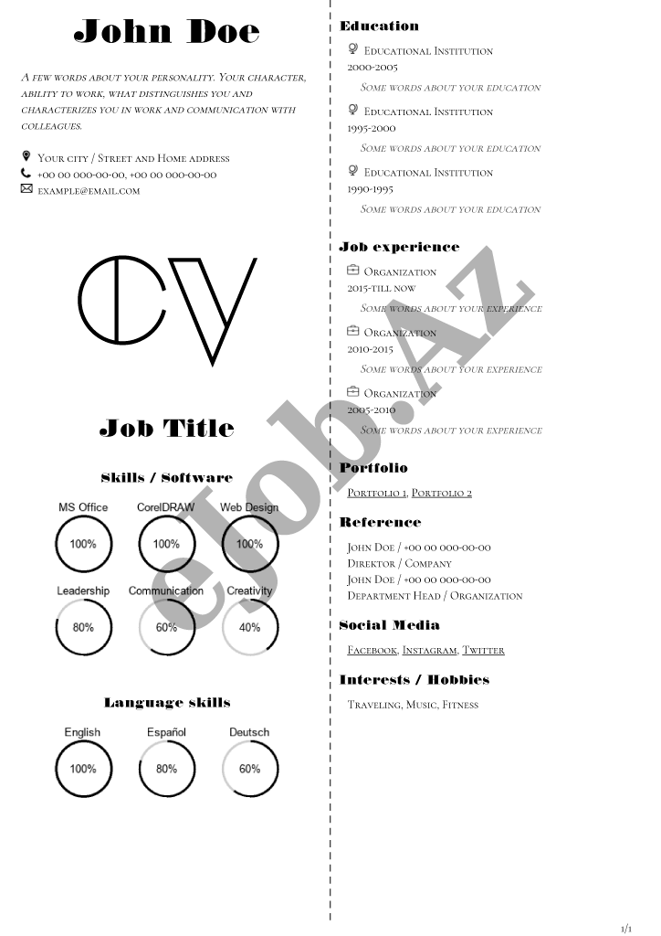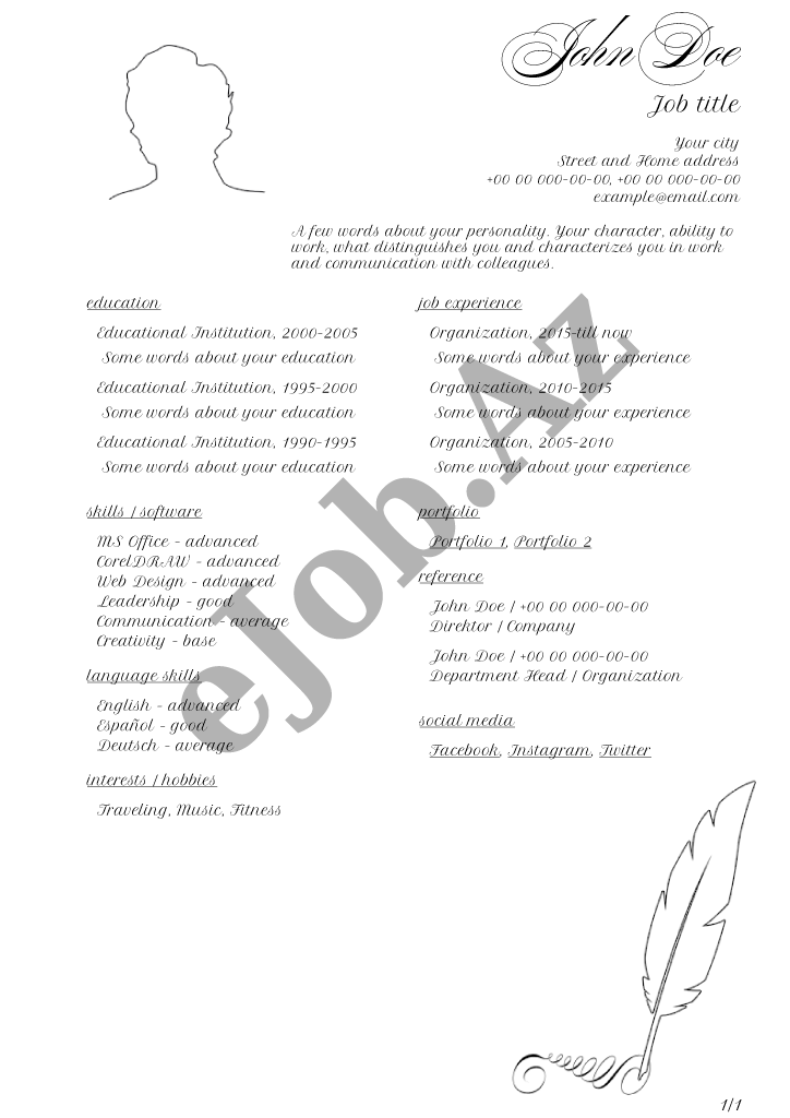İstədiyiniz CV forması seçərək pusluz PDF rezume yarada bilərsiz, bu səhifədə onlayn CV hazırlamaq üçün nəzərdə tutulmuş bütün CV nümunələri göstəlirir.Əldə etdiyiniz PDF CV faylın nümunədə göstərildiyi kimi görünməsini təmin etmək üçün CV forması tam şəkildə və düzgün doldurulmasına diqqət yetirin.